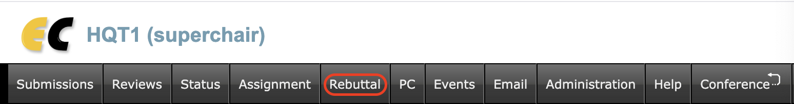 Once the plugin is enabled by a chair, a new tab called “Rebuttal” will appear at the top of the page for the chairs: